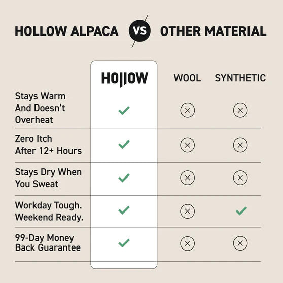 After two years of testing against cotton, wool, and synthetics, it became clear: nothing matches alpaca’s natural ability to stay dry, comfortable, and stink-free.