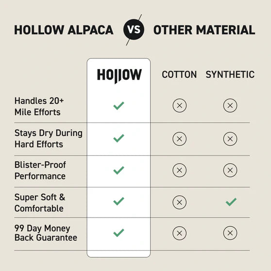 Alpaca wicks sweat away faster than wool or synthetics, keeping your feet bone-dry through 20+ mile efforts.